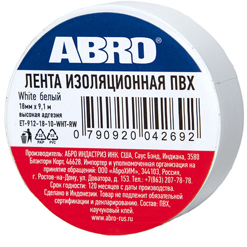Купить ABRO Изолента ПВХ белая 18 мм X 9,1 м в Краснодаре, цена 41 ₽ магазин Автозапчасти