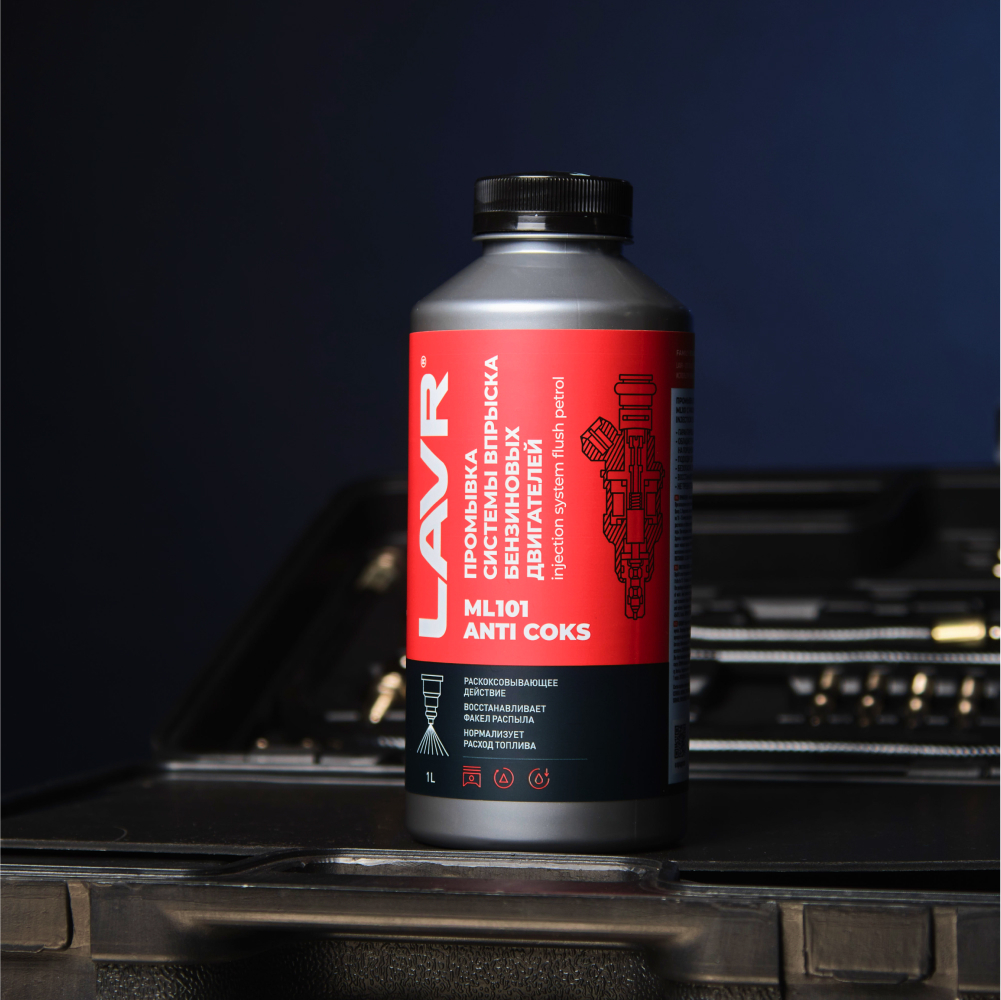 ML101 — это средство для промывки бензиновых систем впрыска без разборки. Оно содержит запатентованный пакет моющих присадок LAVR ISP/DET™, который восстанавливает факел распыла форсунок, удаляет кокс и нагар с нижней части поршней и поршневых колец. В системах с распределенным впрыском жидкость также очищает впускные клапаны. Промывка удаляет до 100% загрязнений в форсунках, не требуя замены масла и свечей зажигания. Она совместима с любыми пневматическими станциями и подходит для бензиновых двигателей с любыми электронными системами впрыска.